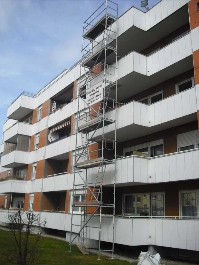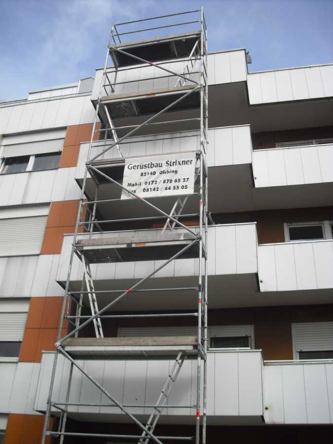 Unsere Gerüstbauer waren bei einem Einsatz in Fürstenfeldbruck tätig. Hier wurde ein Turmgerüst von unseren Gerüstbauern erstellt an dem innenliegende Leitergänge angebracht worden sind, die einen sicheren Aufgang im Gerüst ermöglichen. Das Gerüst wurde an der Balkonbrüstung befestigt. Der Turm hat eine Höhe von rund 13,0 Meter und dient rein als Aufgang für Handwerker die Arbeiten auf der Dachterrasse erledigen. Alternativ hätten unsere Gerüstbauer auch einen Treppenturm erstellen können. An diesem Einsatz waren 3 Gerüstbauer beteiligt.