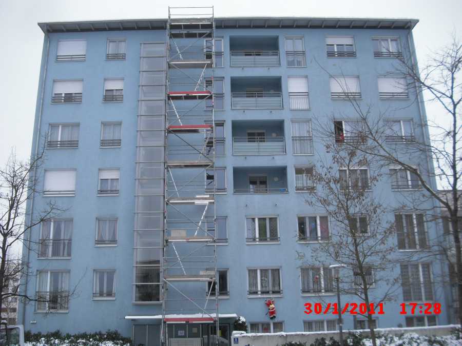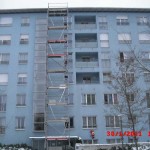 Unsere Gerüstbauer waren bei einem Einsatz in München bei der Arbeit tätig gewesen. Hier ist von unserem Gerüstbau ein Gerüstturm erstellt worden, den unsere Gerüstbauer mit Seil und Rolle aufgestellt haben. Der Gerüstturm hat eine Höhe von 20,00 Meter. Dieses Gerüst ist ein sogenanntes Fassadengerüst, da es mit Hilfe von Dübeln an der Fassade verankert worden ist. Innenliegende Leitergänge, die unser Gerüstbau zusätzlich angebracht hat, sorgen für einen sicheren Aufgang der Arbeiter im Gerüst. Das Gerüst wurde mit Hilfe eines Transporters von 3 Gerüstbauern, die am Einsatzort München beteiligt waren, herbeigeschafft und innerhalb von 3 Stunden aufgebaut.