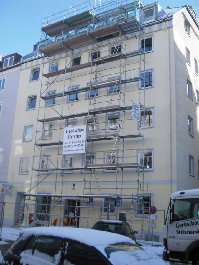 Es wurden Straß-beziehungsweise Hofseite von unseren Gerüstbauern eingerüstet, um das Dachgeschoss auszubauen. Das Fassaden-oder Lehrgerüst wurde an der Wand in München von den Gerüstbauern befestigt.Außerdem wurde noch ein Dachfangnetz eingebaut. Ein Dachfangnetz, oder auch Dachfang genannt, dient zum Auffangen von Gerüstmaterialien, sowie Personen. Das Gerüst steht auf dem Fußweg, deshalb musste noch ein Passantentunnel montiert werden. Am Baugerüst zur Straßenseite wird von unseren Gerüstbauern noch ein GEDA 500 Z/ZP Zahnstangenaufzug montiert. Das dient zum Tragen von Personen und Materialien bis zu 500 Kilogramm. Der Bauaufzug wird dann im Anschluß für die Demontage des Fassadengerüstes genutzt.