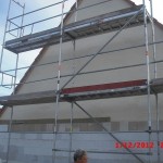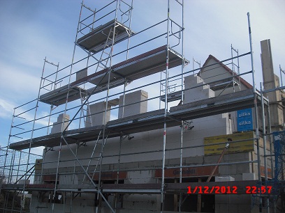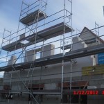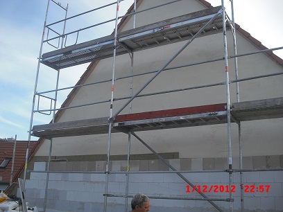 Auf diesen Bildern kann man ein Haus in seinem Rohzustand erkennen. Um diesen Rohbau zu vollenden, wurde von uns ein so genanntes Arbeitsgerüst erstellt. Ein sicherer Zugang zu allen Gerüstetagen muss gewährleistet werden. Deshalb bekommt jedes Gerüst innenliegende Leitergänge, die einen sicheren Aufgang in die einzelnen Gerüstetagen ermöglichen. Ein Arbeitsgerüst muss Personen, sprich Arbeiter, Werkzeuge und Materialien tragen. So kann man sicher Stein auf Stein setzen, verputzen und andere diverse Arbeiten ausführen.