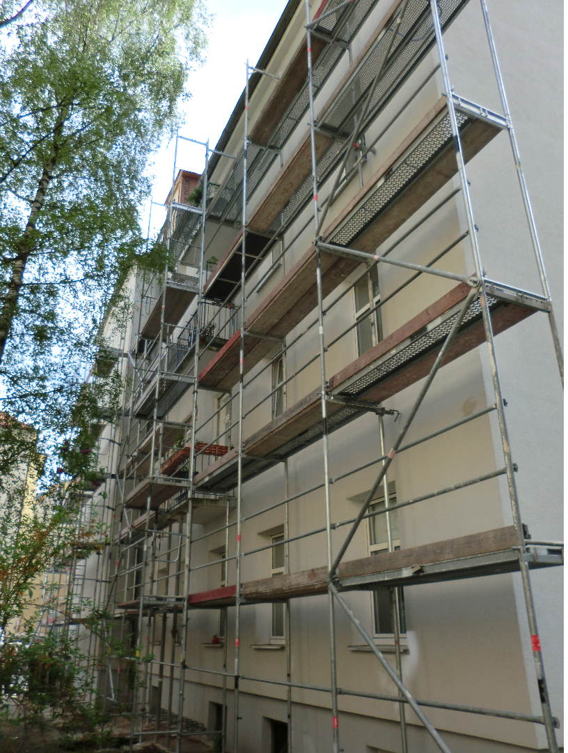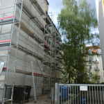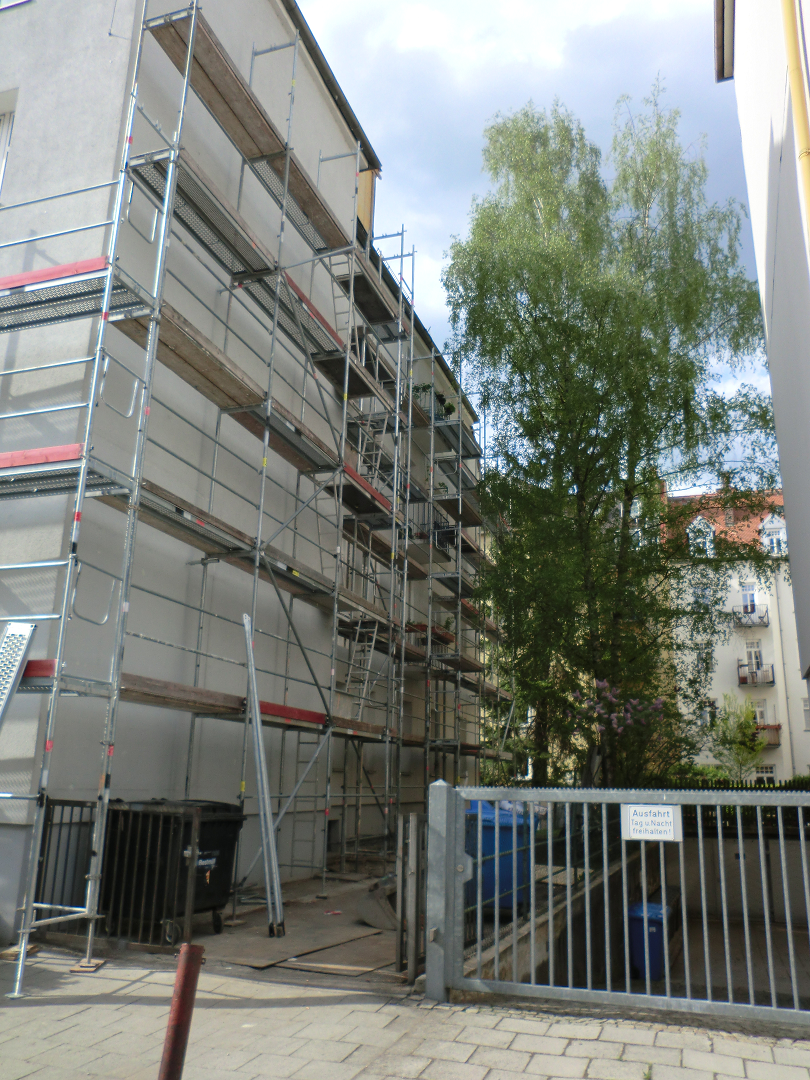 Wir rechnen mit einer Gerüstvorhaltung von ungefähr 4 Wochen bis alle Arbeiten abgeschlossen sind und unsere Gerüstbauer in München wieder abbauen können. Auftraggeber für den Gerüstbau in München ist die Firma Hönninger.