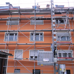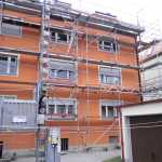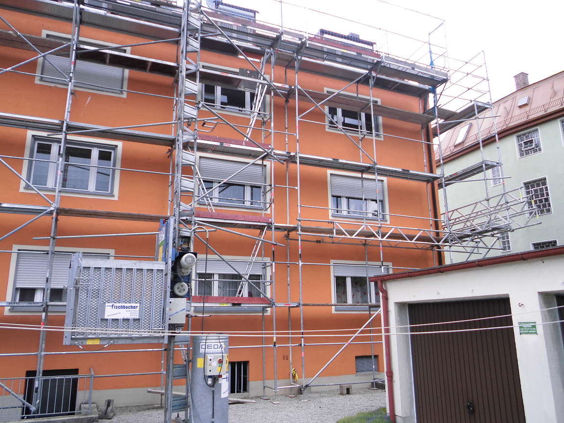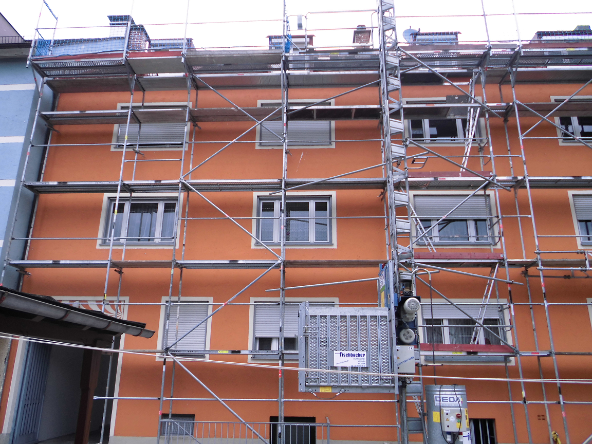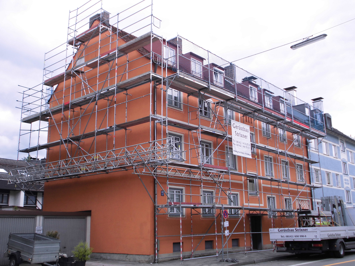 In München wurde ein einem Miethaus ein Gerüst erstellt, welches benötigt wird, um Fassadenarbeiten verrichten zu können. Außerdem muss am Dach gearbeitet werden. Das Fassadengerüst wurde mit Hilfe von Dübeln an der Fassade verankert. innenliegende Leitergänge, die unsere Gerüstbauer ebenfalls angebracht haben sorgen für einen sicheren Aufgang von Arbeitern innerhalb des Gerüstes. An der Fassade sollen kleinere Ausbesserungen stattfinden. Außerdem soll frisch gestrichen werden. An diesem Einsatz in München waren 3 Gerüstbauer beteiligt die das Gerüstmaterial mit einem unserer Sprinter aus dem Fuhrpark zum Einsatzort fuhren. In diesem befinden sich Mercedes Ategos, Sprinter, Anhänger, sowie Stapler, in allen Größen,die je nach Umfang der Baustelle zum Einsatz kommen.