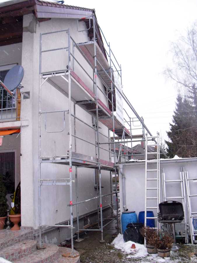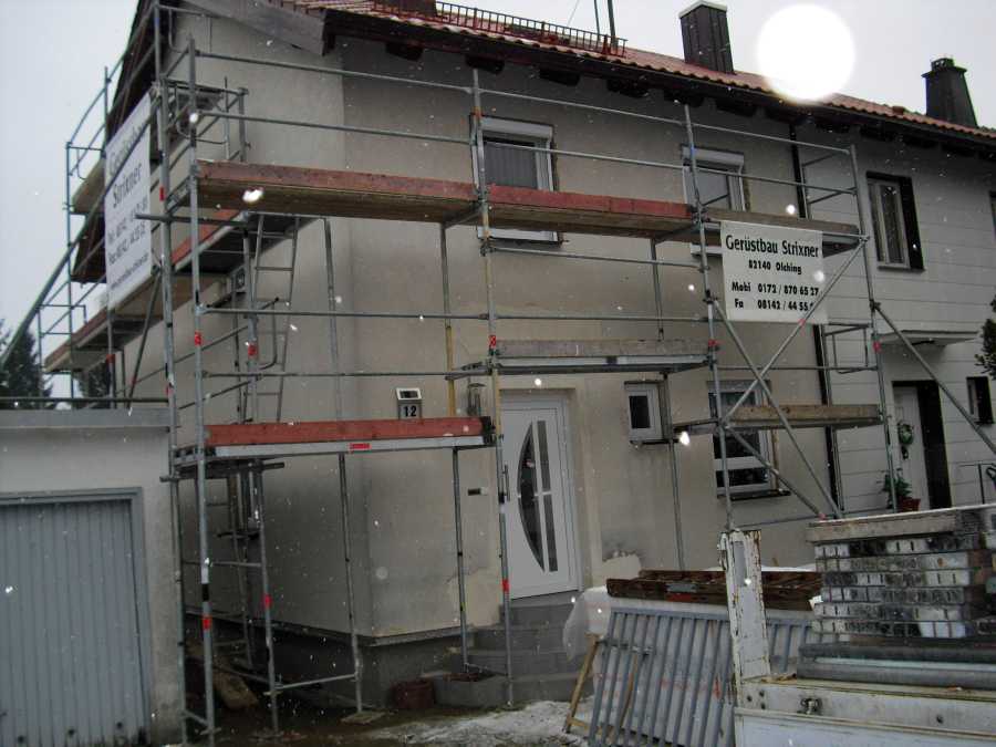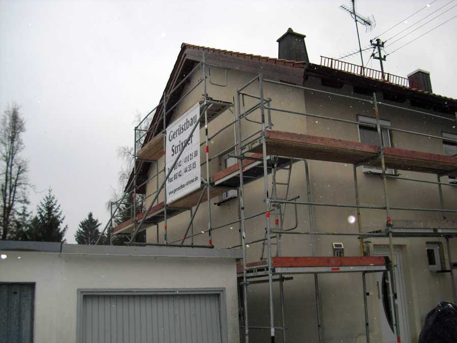 Unsere Gerüstbauer waren in Germering erneut bei einem Einsatz tätig. Diese haben ein Fassadengerüst erstellt, das ohne Verankerung an der Fassade aufgestellt worden ist. Das nennt man auch ein sogenanntes freihstehendes Gerüst. Das Gerüst in Germering wurde von unseren Gerüstbauern aufgestellt, um die Fassade an der Doppelhaushälfte zu dämmen (Hier wird ein Wärmedämmverbundsystem, kurz WDVS angebracht) Um einen sicheren Aufgang im Fassadengerüst zu ermöglichen, wurde von unseren Gerüstbauern innenliegende Leitergänge angebracht.