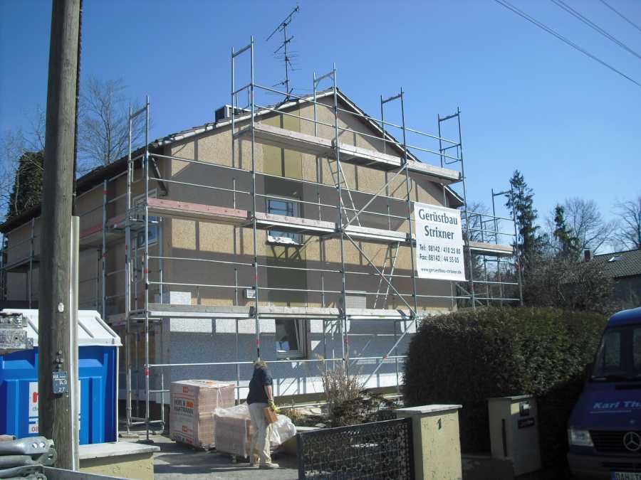 Unsere Gerüstbauer waren bei einem Einsatz in Gröbenzell tätig. Es wurde ein sogennantes Fassadengerüst erstellt, das eine Größe von 250 Quadratmeter beträgt. Das Gerüst dient für Dämmarbeiten an der Fassade. Dies ist kein freihstehendes Gerüst, da es mittels langer Ringschrauben am Gebäude verankert worden ist. Zusätzlich sorgen innenliegende Leitergänge, die von unseren Gerüstbauern angebracht worden sind, für einen sicheren Aufgang im Gerüst. An diesem Einsatz waren 2 Gerüstbauer und 1 Gerüstbauhelfer beteiligt.