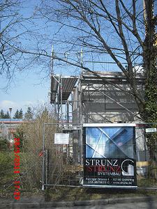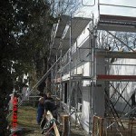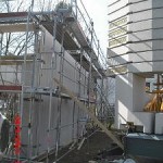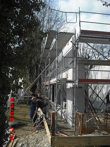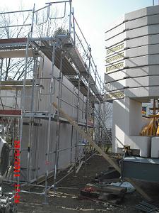 Unsere Gerüstbauer waren bei einem Einsatz in München tätig gewesen. Wie man hier sehen kann wurde hier ein Gerüst an einem Haus erstellt, das benötigt wird um Fassadenarbeiten ausführen zu können. Auf den Bildern erkennt man Arbeiter, die gerade dabei sind, Aluminiumstangen anzubringen, um das Gerüst abzustützen. Deshalb bezeichnet man dieses Gerüst auch als freihstehendes Gerüst.